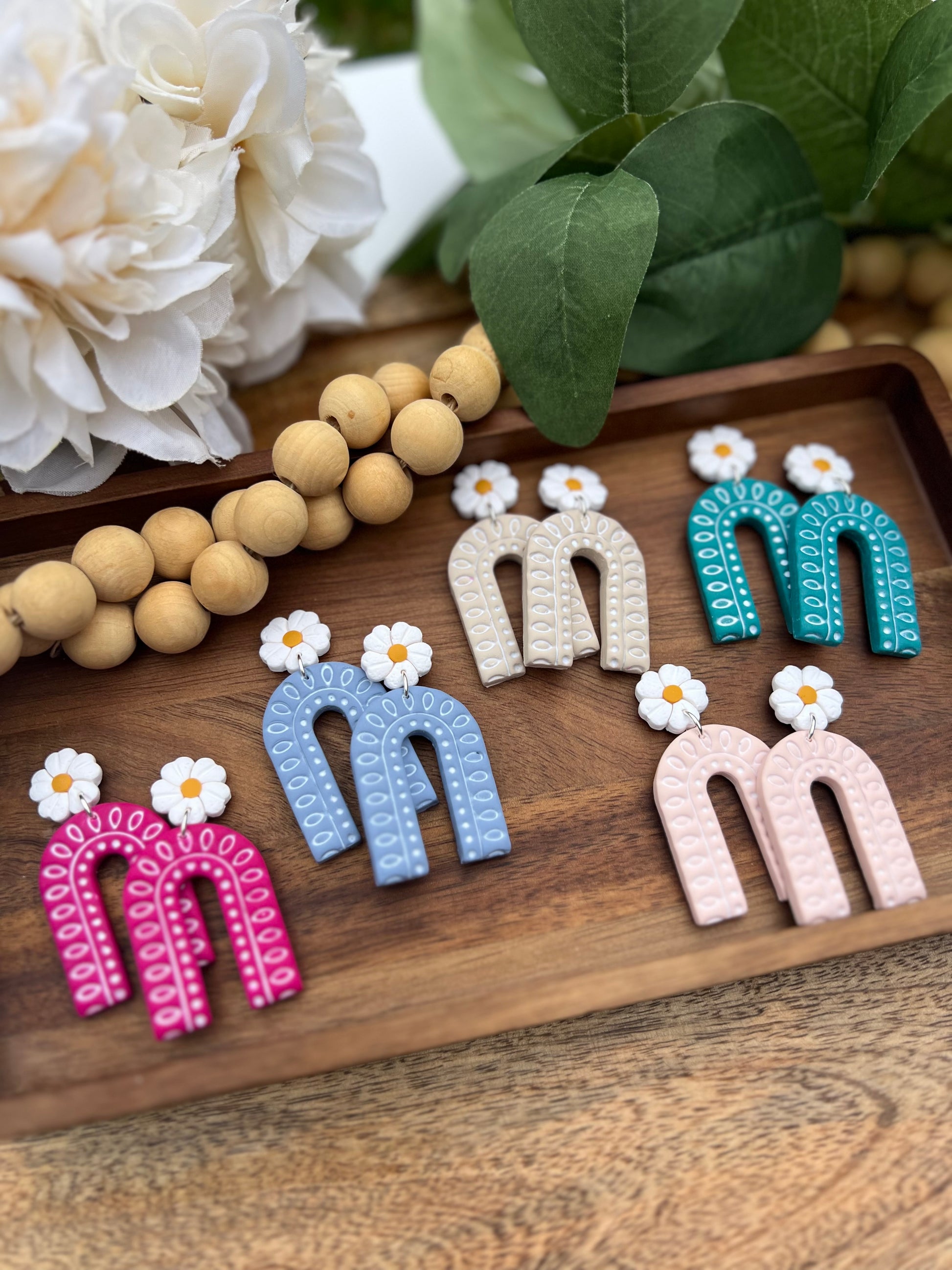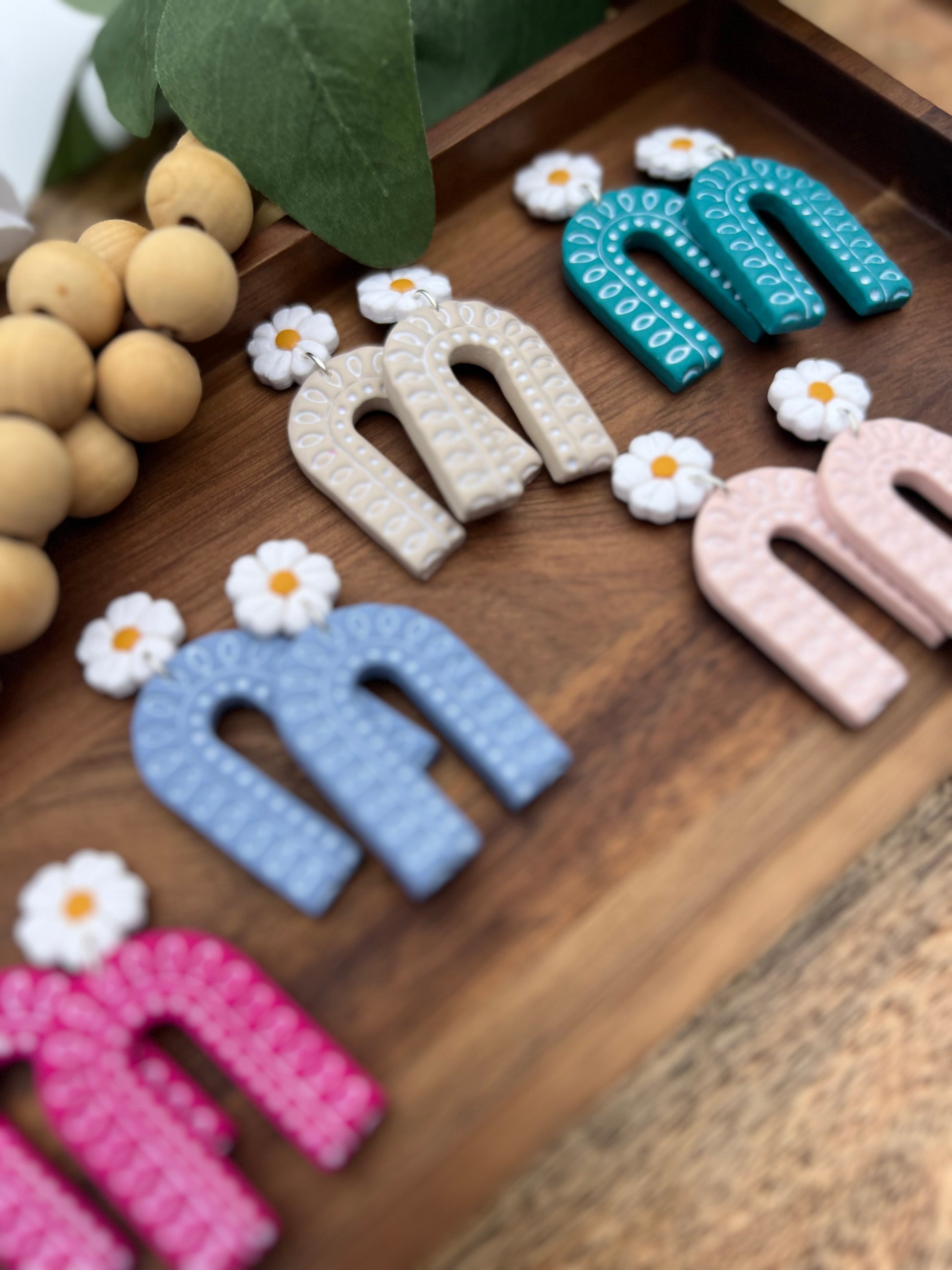 ♡ Lightweight, polymer clay earrings in an arch dangle with daisy post. Available in 5 different colors.