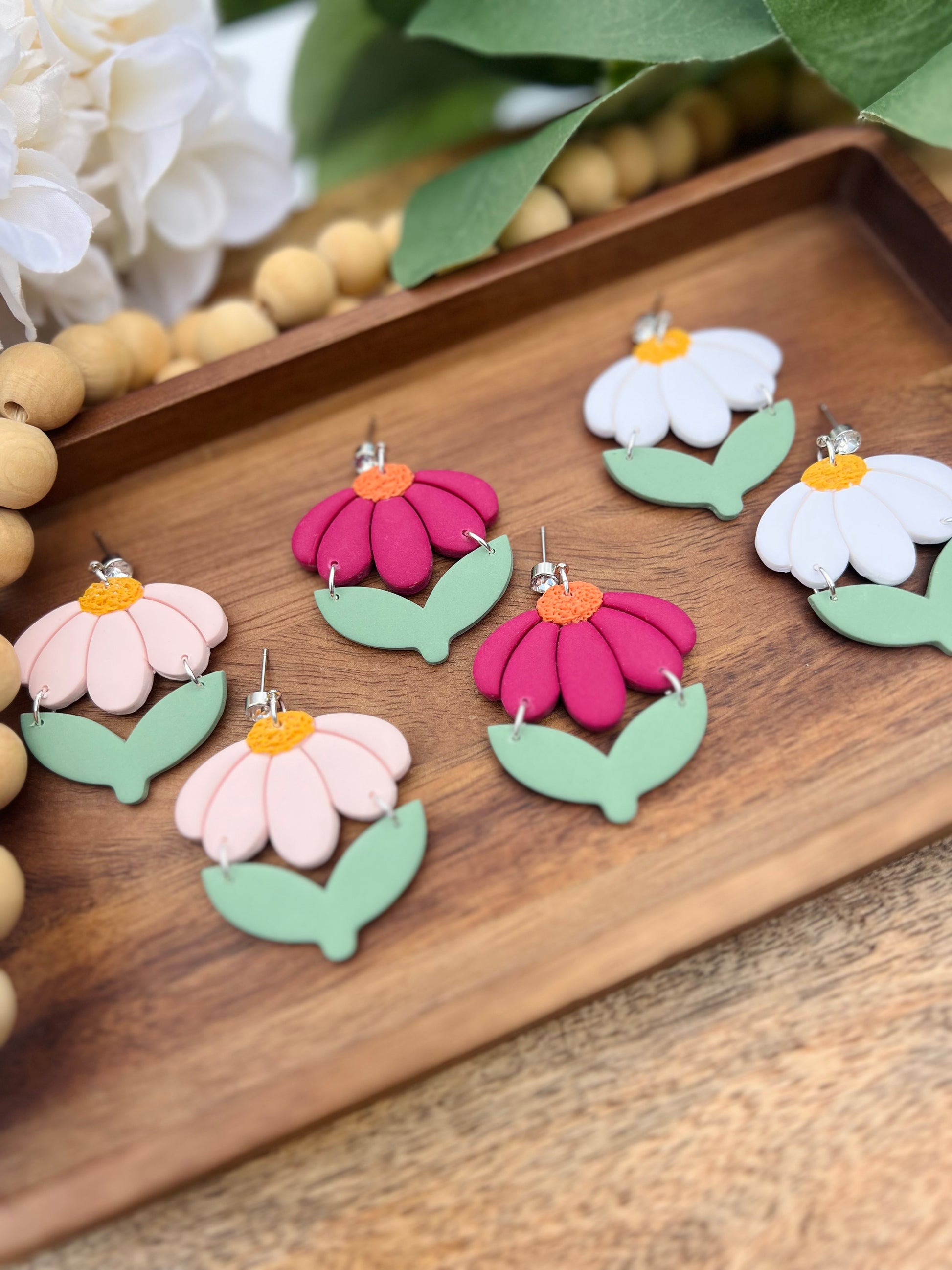 ♡ Lightweight, polymer clay earrings handcrafted into a large daisy dangle, available in 3 different colors - lt. pink / fuchsia / white. Also, available in gold/silver earring post.