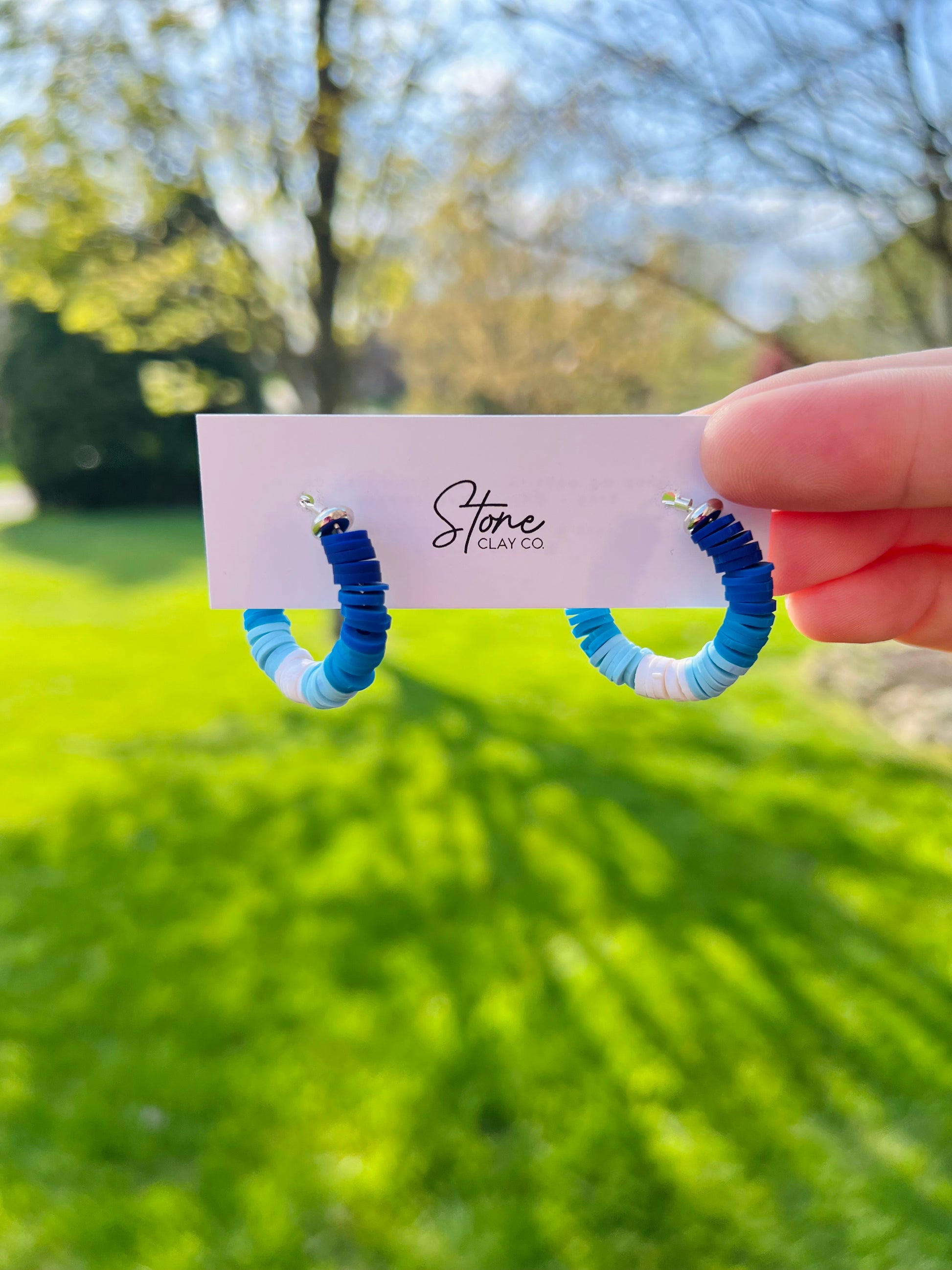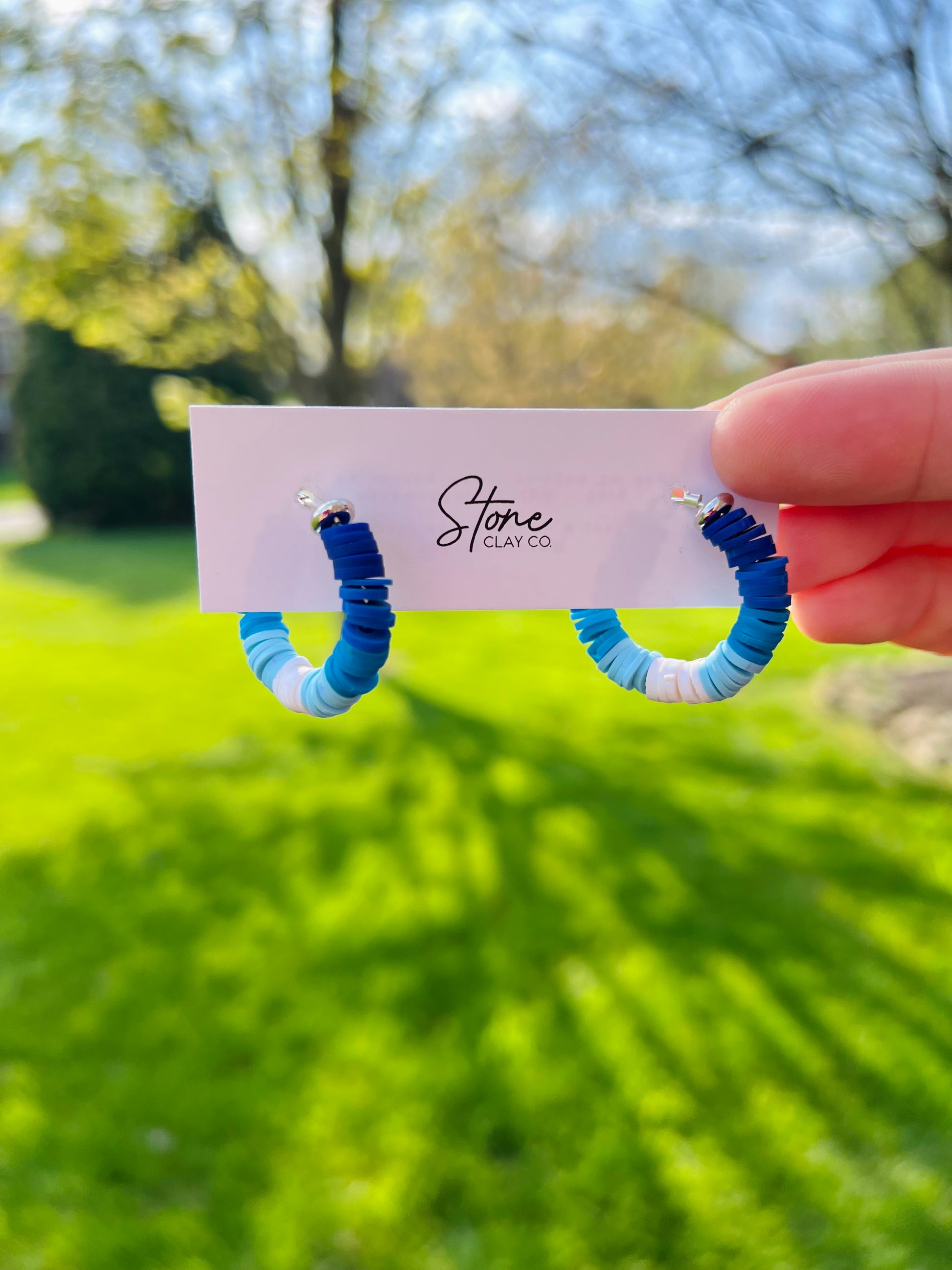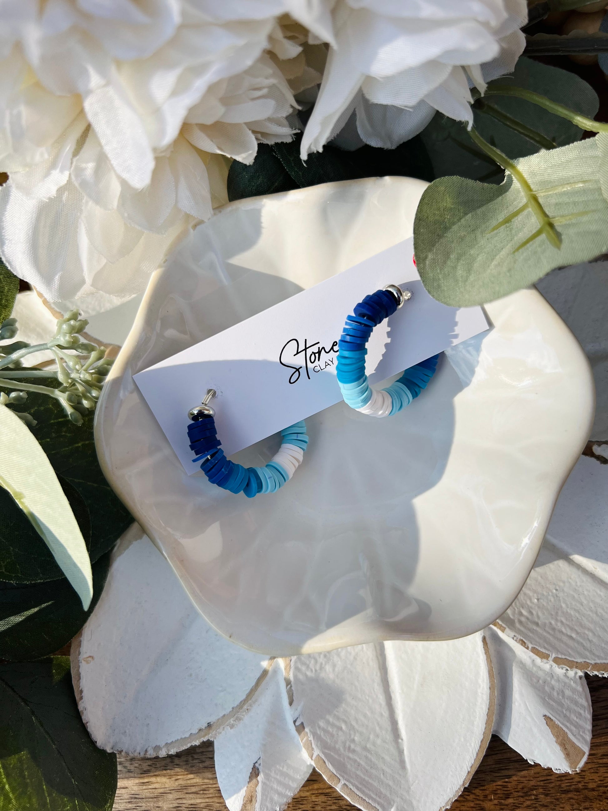 ♡ Lightweight, polymer clay earrings in ocean blue ombre heishi beaded hoops.