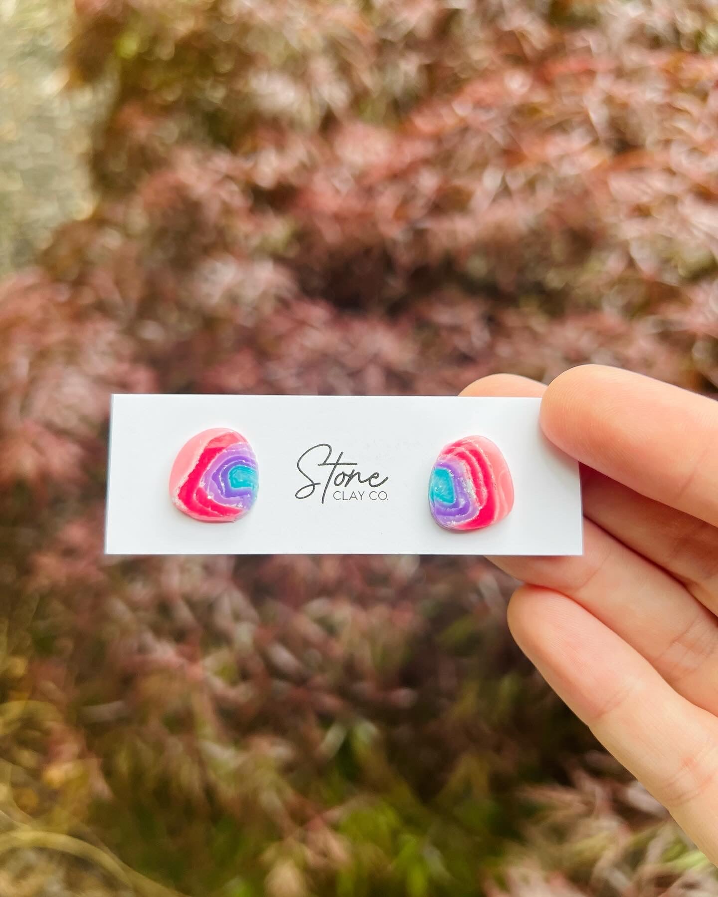 ♡ Lightweight, polymer clay earrings in a pink agate gemstone design.