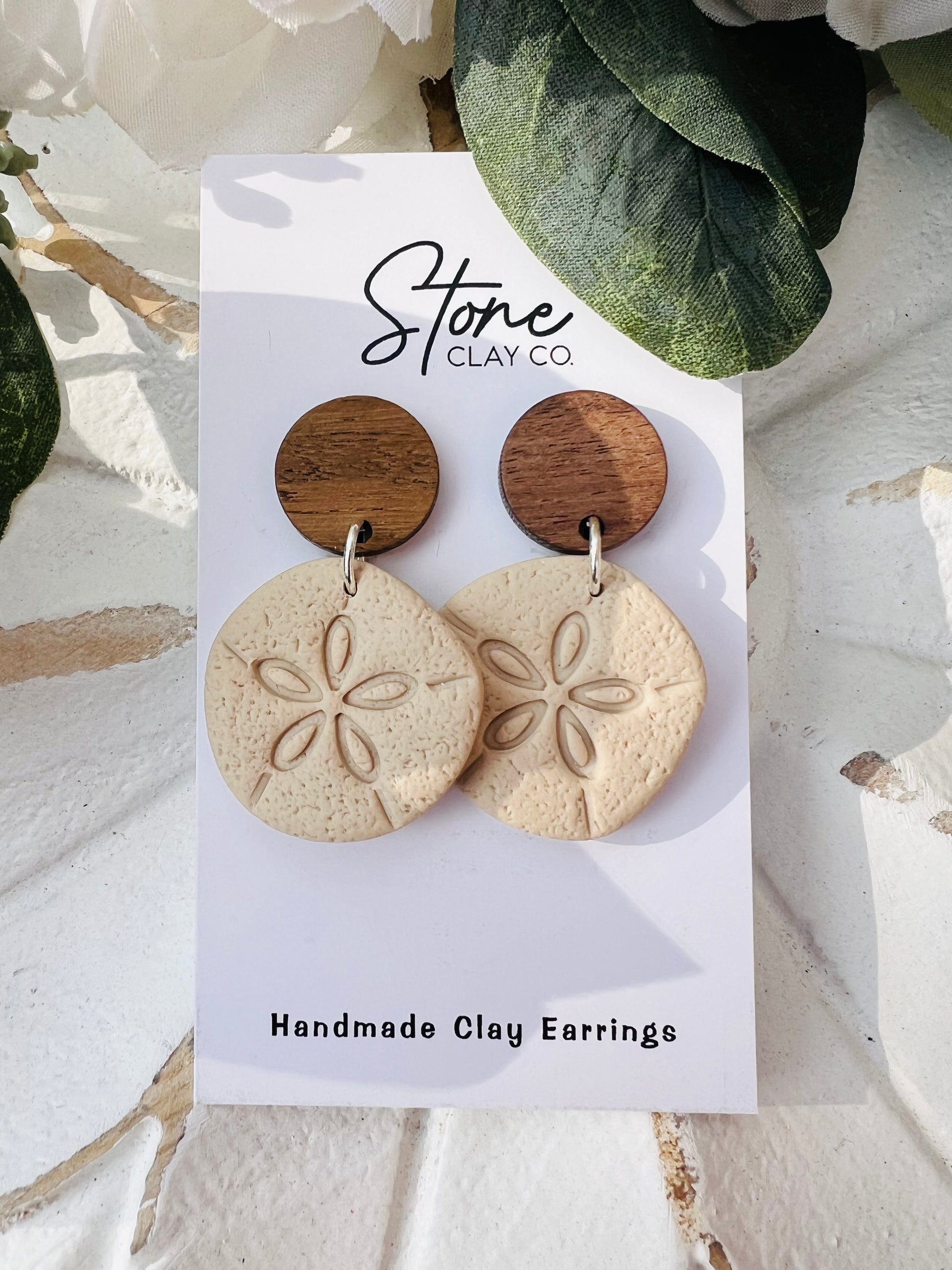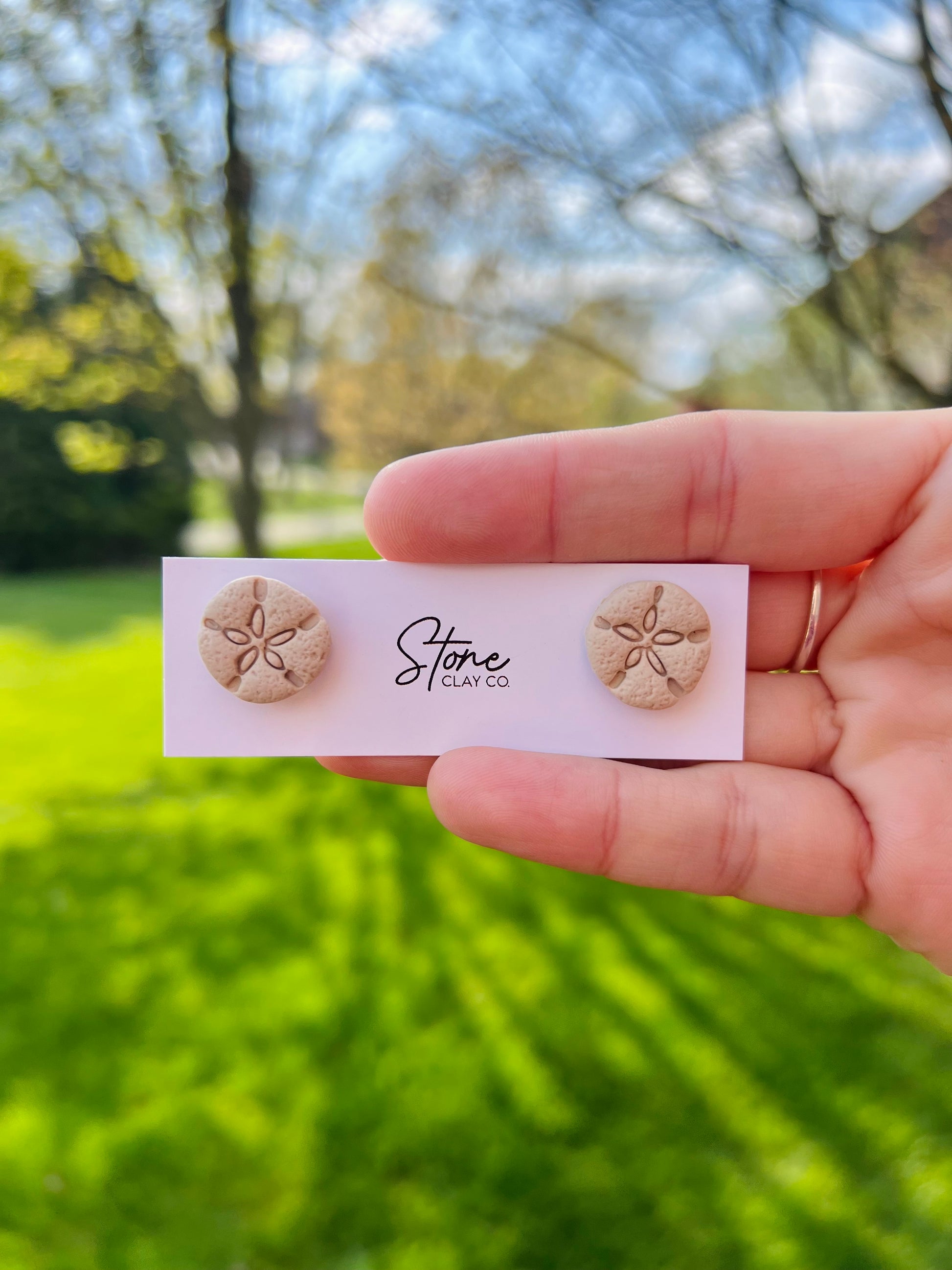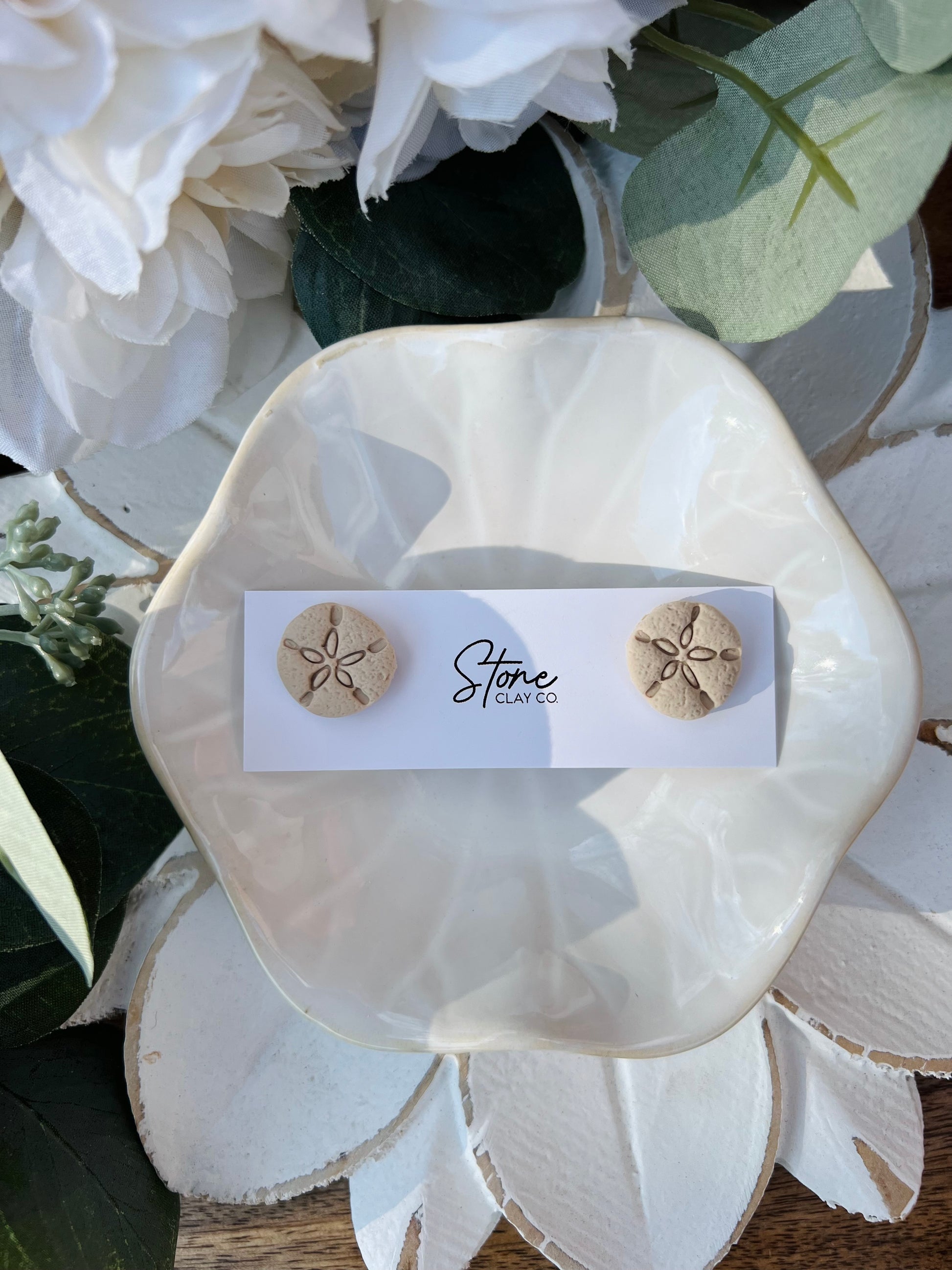 ♡ Lightweight, polymer clay earrings in a Sand Dollar dangle/stud design.