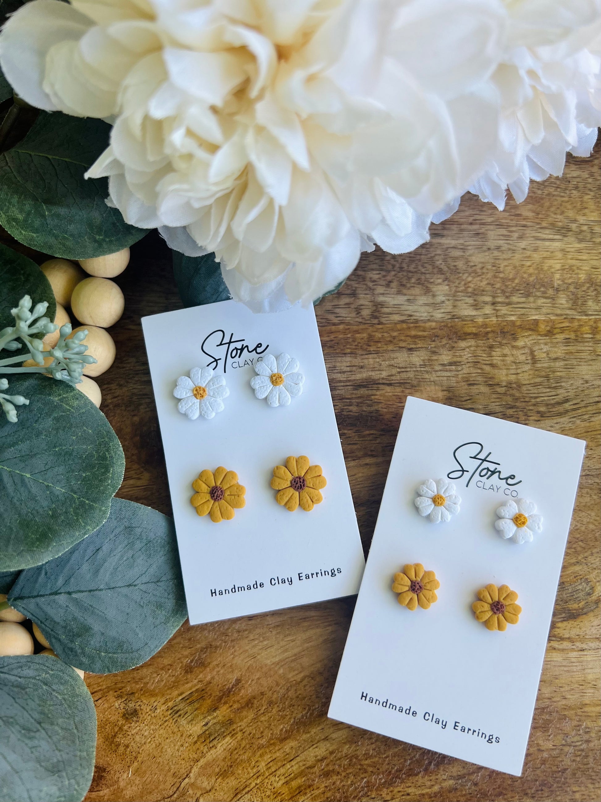♡ Lightweight, polymer clay earrings in a stud pack including two pairs: daisy & sunflower studs.